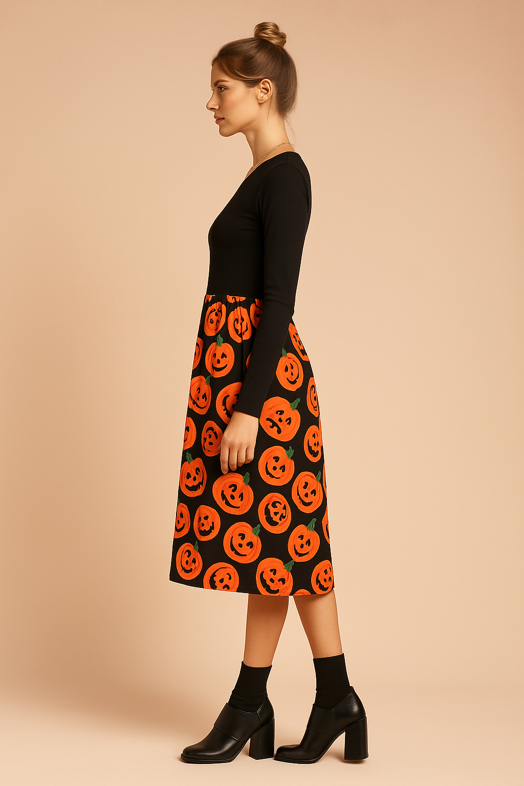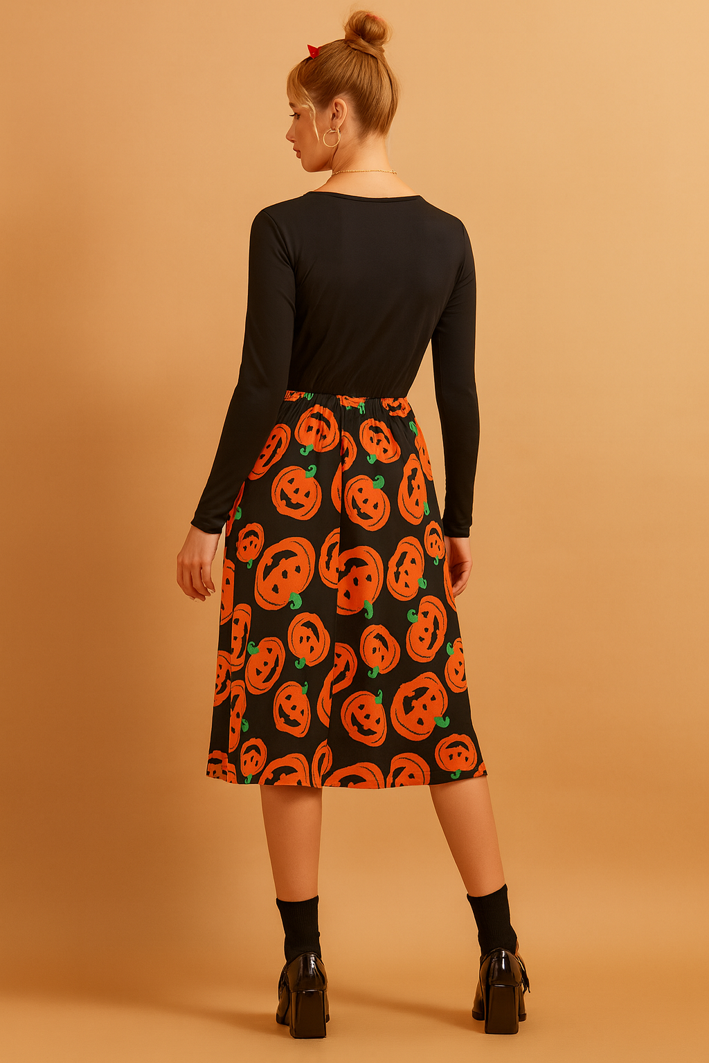 Sukienka halloweenowa z długim rękawem w kolorze czarnym z rozkloszowaną spódnicą midi ozdobioną pomarańczowym nadrukiem dyni z uśmiechniętymi twarzami.