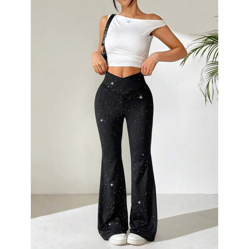 Te legginsy z efektem brokatu wyróżniają się subtelnym błyskiem, który dodaje stylizacji wyjątkowego charakteru. Rozszerzana nogawka optycznie wydłuża nogi i wysmukla sylwetkę.