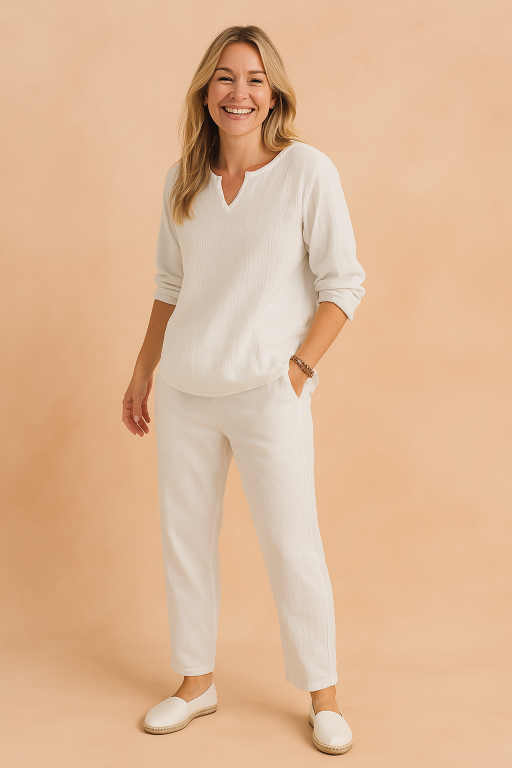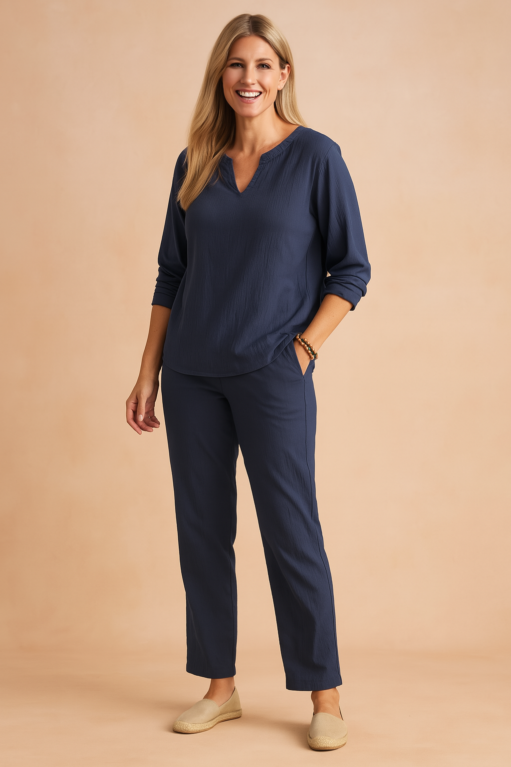 Zestaw doskonale sprawdzi się zarówno na spacery, jak i wakacyjne wyjazdy. Długi rękaw i klasyczne spodnie tworzą elegancki, ale swobodny look.