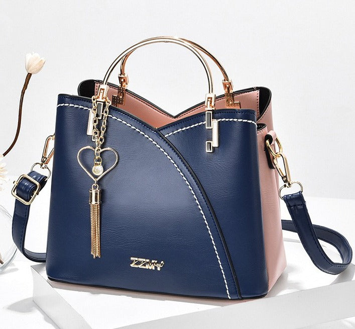 Navy blue and blush pink structured faux leather handbag with gold metal handles, heart tassel charm, and contrast stitching, displayed on a warm beige platform with soft lighting.