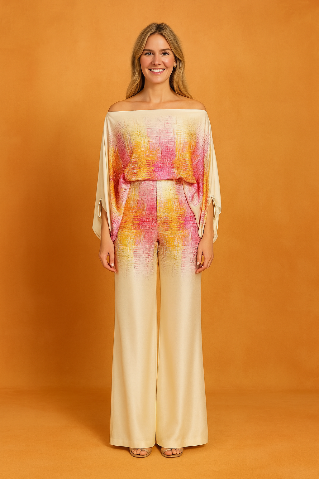Elegant satin wide-leg coord set in cream with a vibrant abstract overlay in pink, yellow, and orange, featuring a draped off-the-shoulder top and matching flowing trousers.