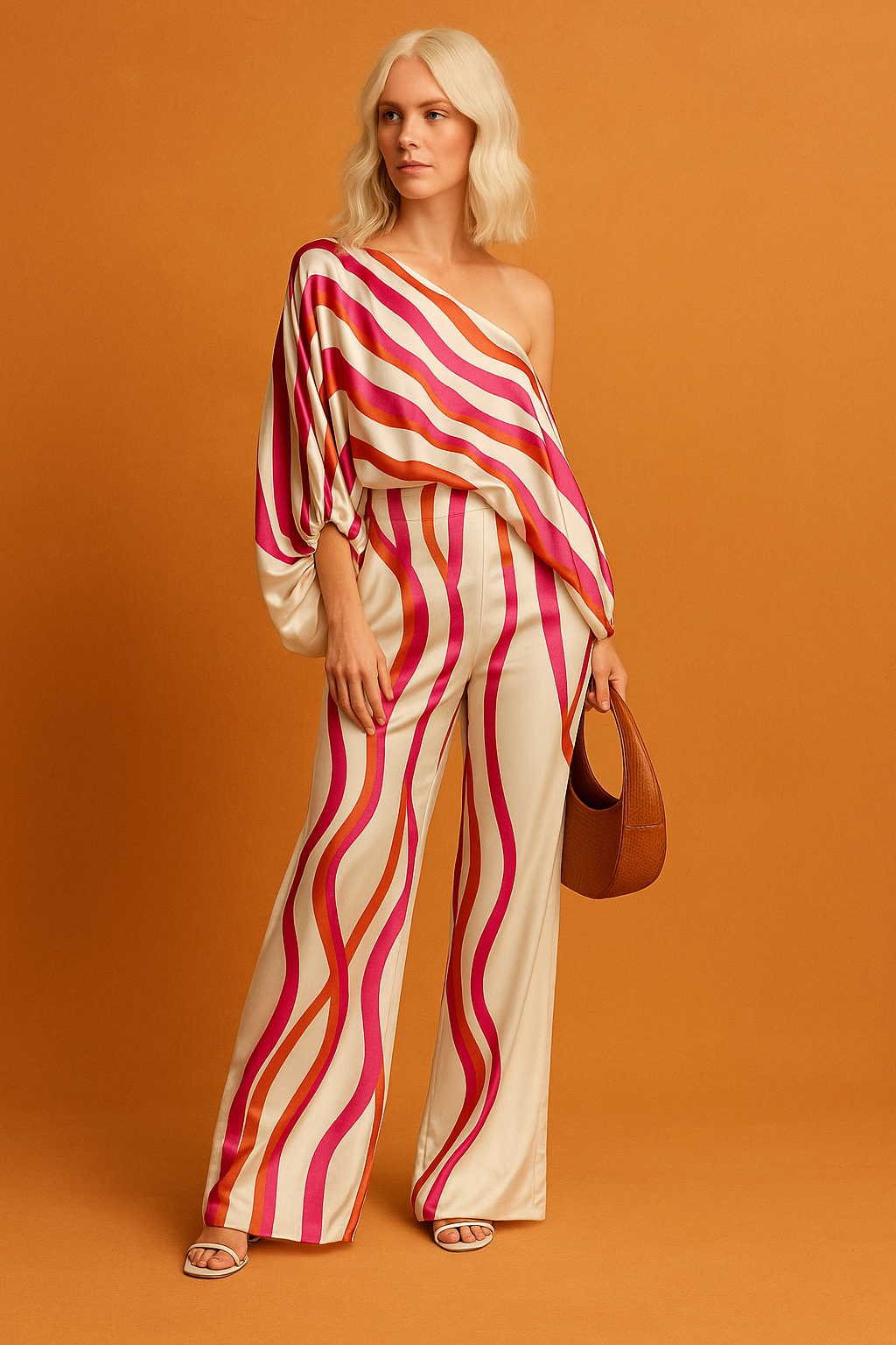 Cream satin two-piece set with magenta, red, and orange wavy stripes, designed with an off-shoulder oversized blouse and matching high-waisted wide-leg trousers, accessorized with a brown crescent bag and heeled sandals.