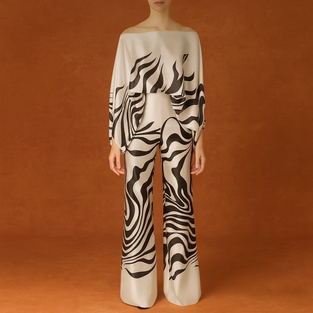 Satin coord set featuring a loose off-shoulder top and wide-leg trousers, both printed with bold black abstract wave patterns on a creamy beige base. The luxurious fabric has a smooth, high-sheen finish that enhances the fluidity of the draped silhouette, creating a refined and artistic statement look.