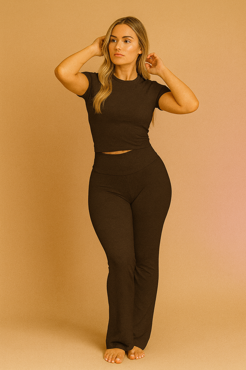 damski komplet sportowy z obcisłą koszulką i legginsami w kolorze ciemnobrązowym