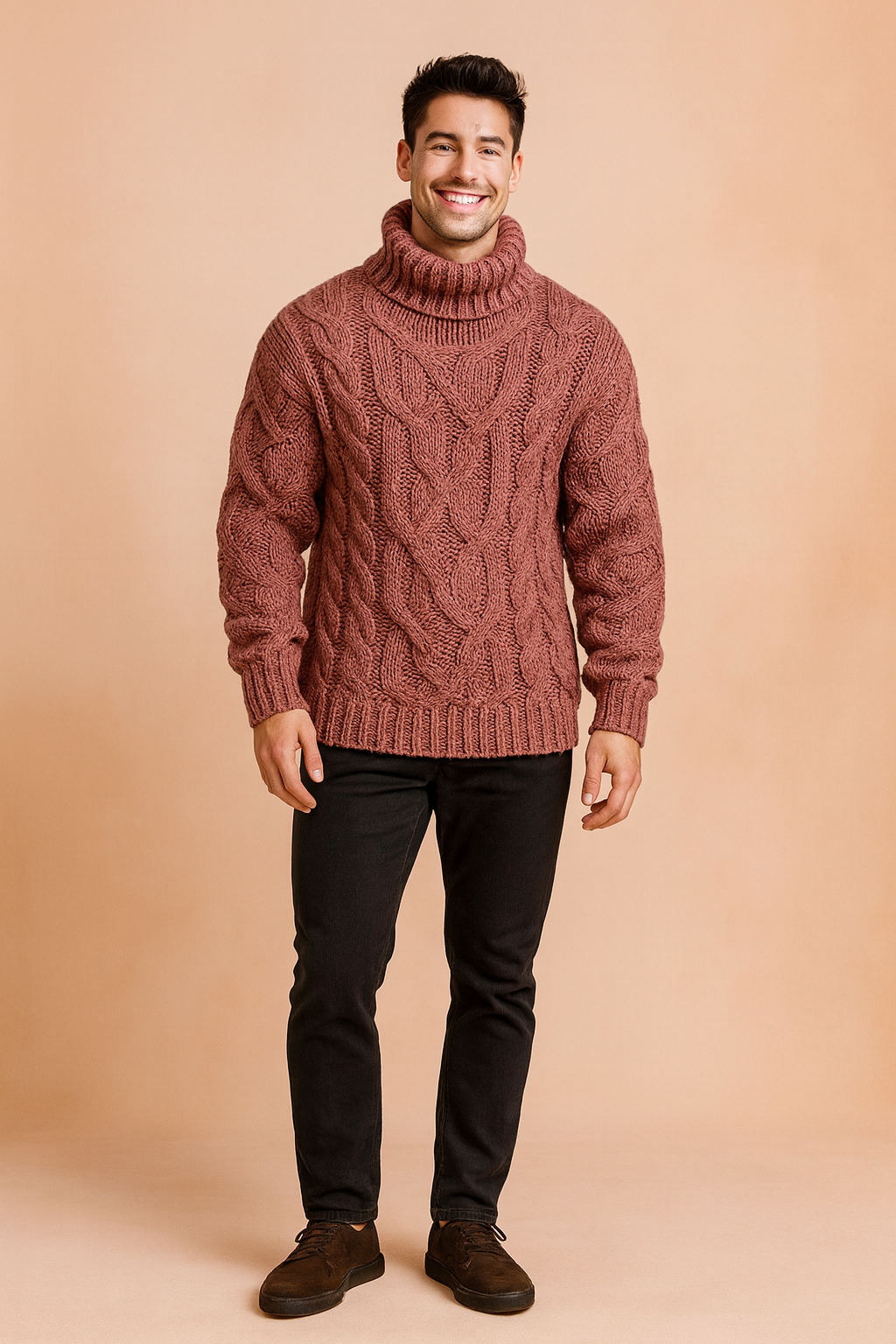 Men’s chunky knit turtleneck sweater in warm rose-brown with intricate cable pattern, designed for casual winter wear and cozy layered styling.