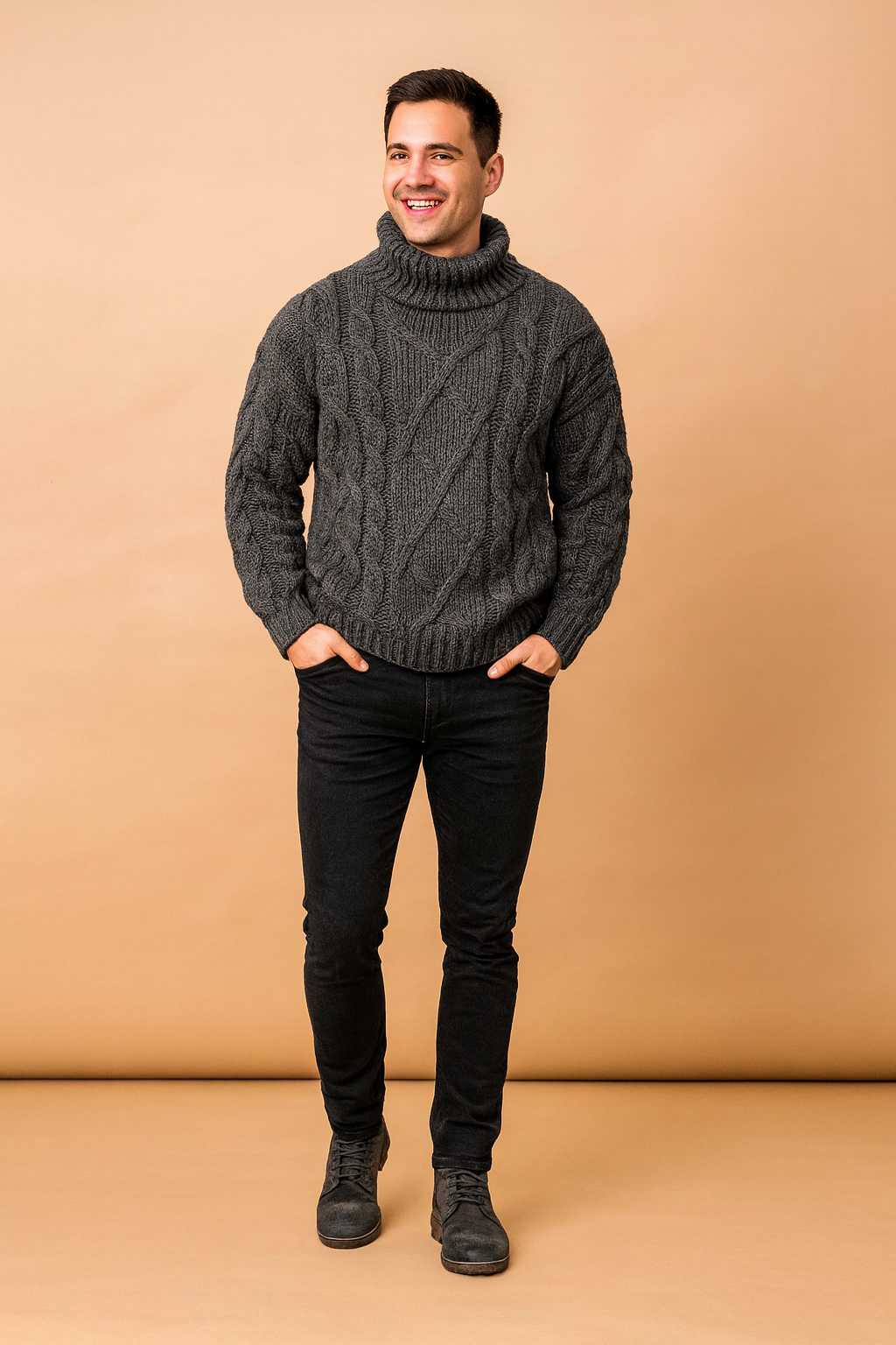 Chunky gray cable knit turtleneck sweater for men with thick ribbed detailing and relaxed fit