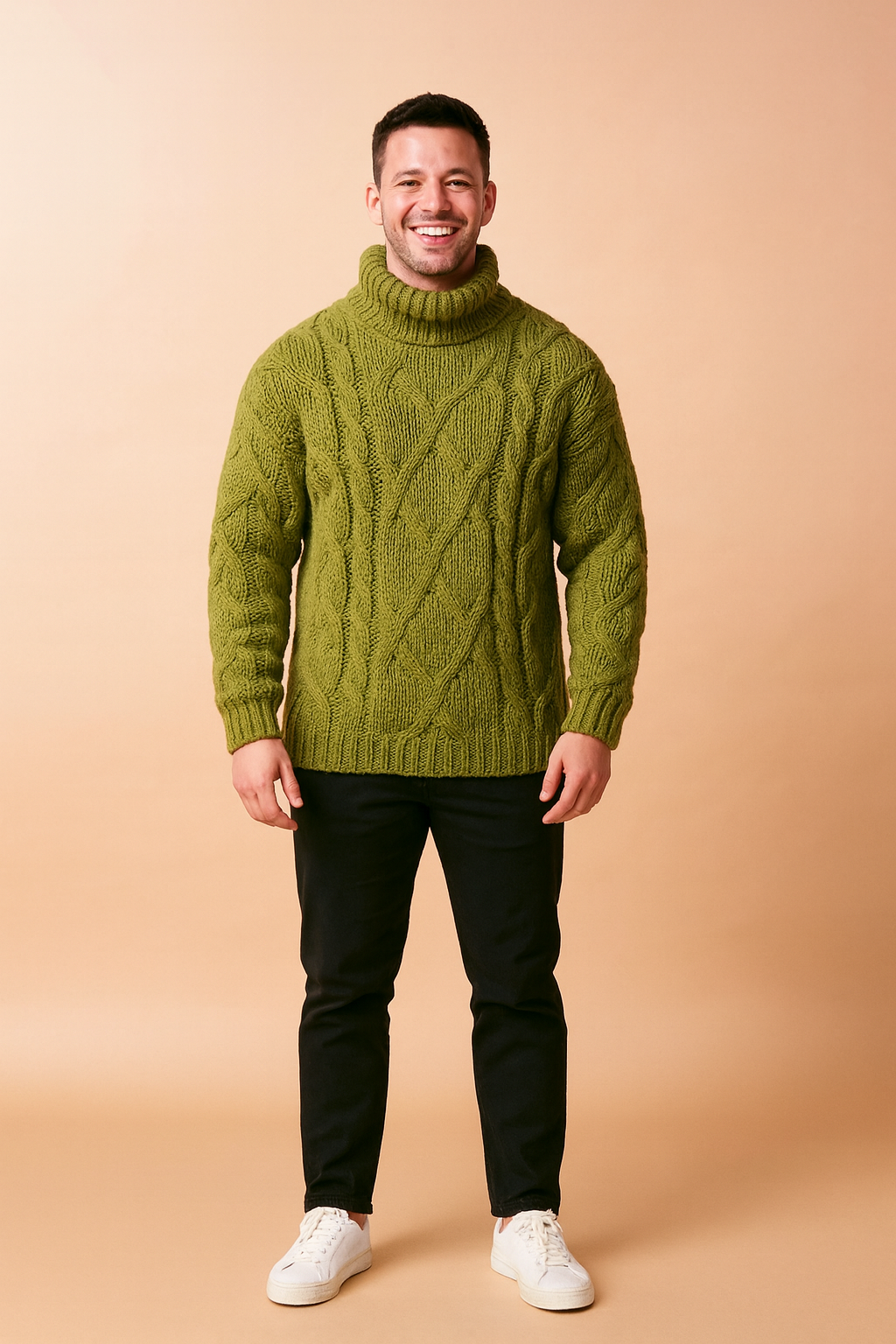 Thick olive cable knit turtleneck sweater with exaggerated textures and a slouchy relaxed fit, perfect for bold winter styling.