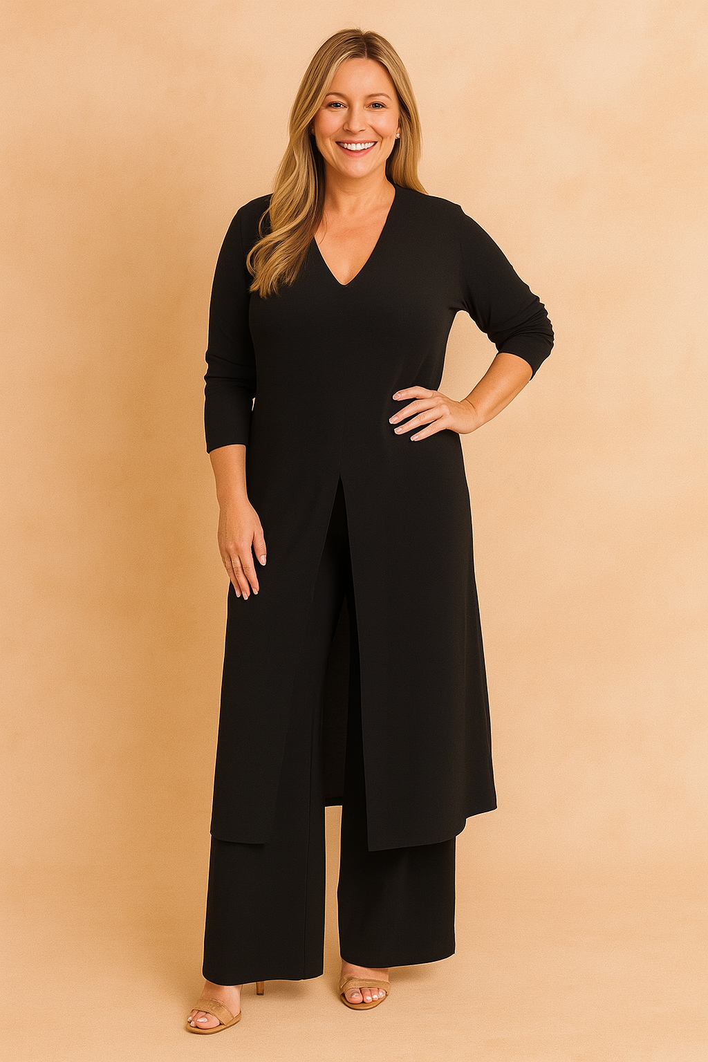 Elegant black coord set featuring a V-neck long tunic with a center slit, styled over matching wide-leg trousers in smooth, structured fabric.