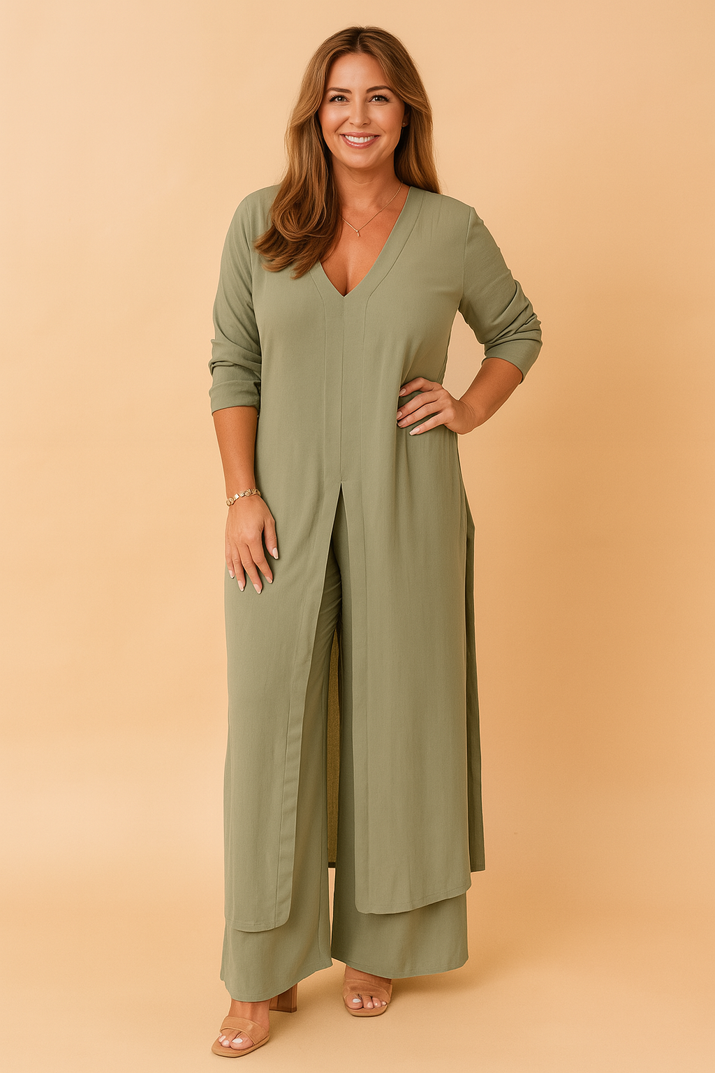 Sage green V-neck longline coord set with front slit detailing and wide-leg trousers, made from soft flowy fabric and styled with rolled sleeves and nude block-heel sandals.