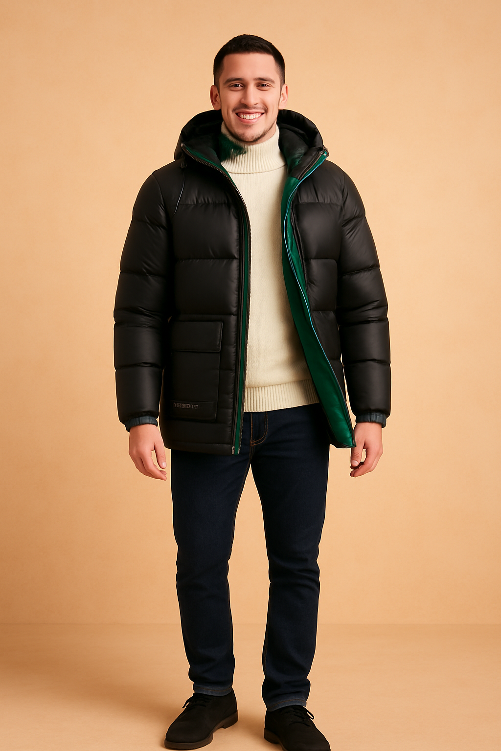 Men's black puffer jacket with green inner lining, front zipper closure, and insulated design for warmth.