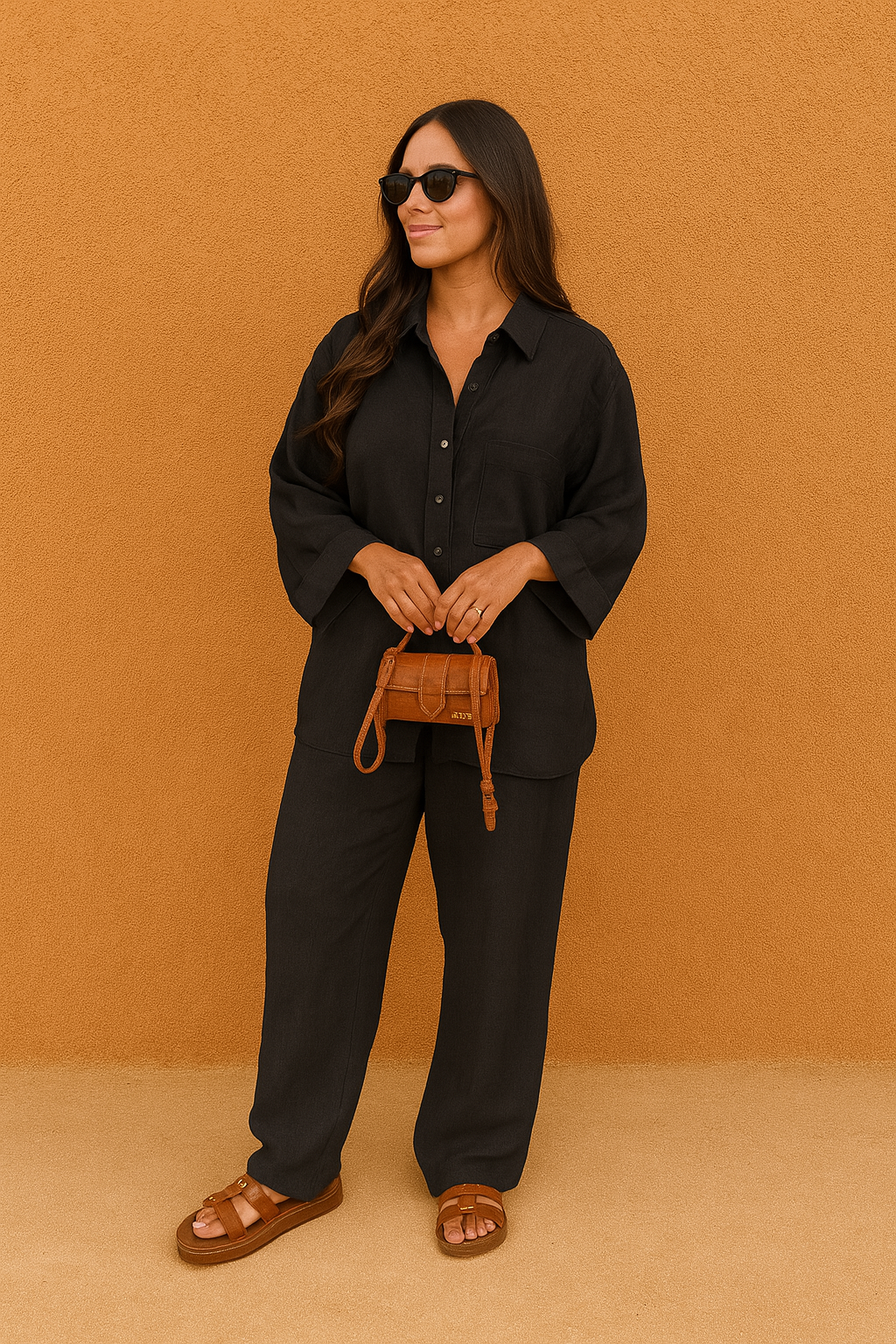 Relaxed-fit black linen button-down shirt with front chest pocket, paired with matching wide-leg black linen trousers, styled with brown leather sandals and a structured tan crossbody bag.