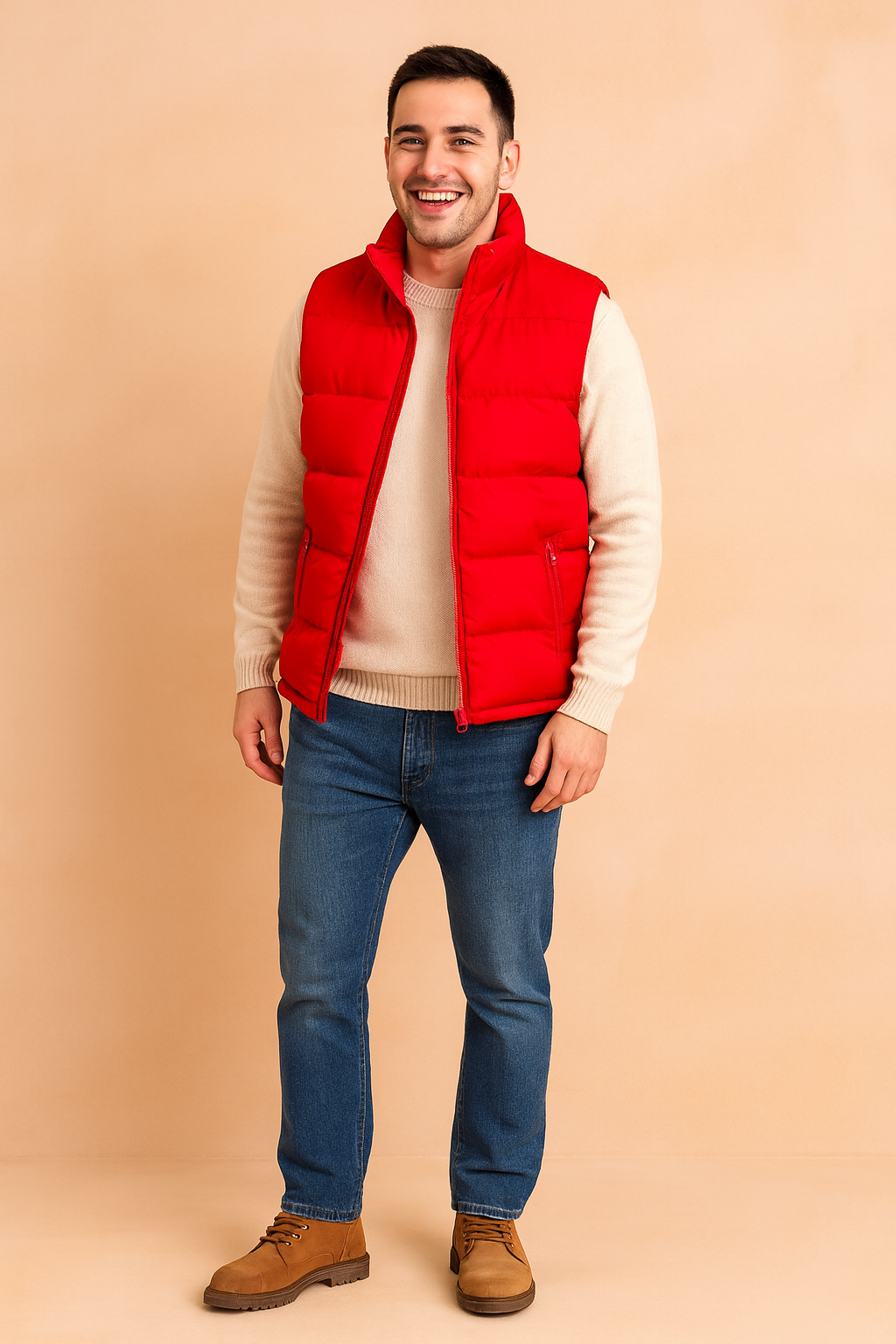 Men’s red puffer vest with front zipper, horizontal quilted design, and dual zippered pockets, styled for casual winter wear.