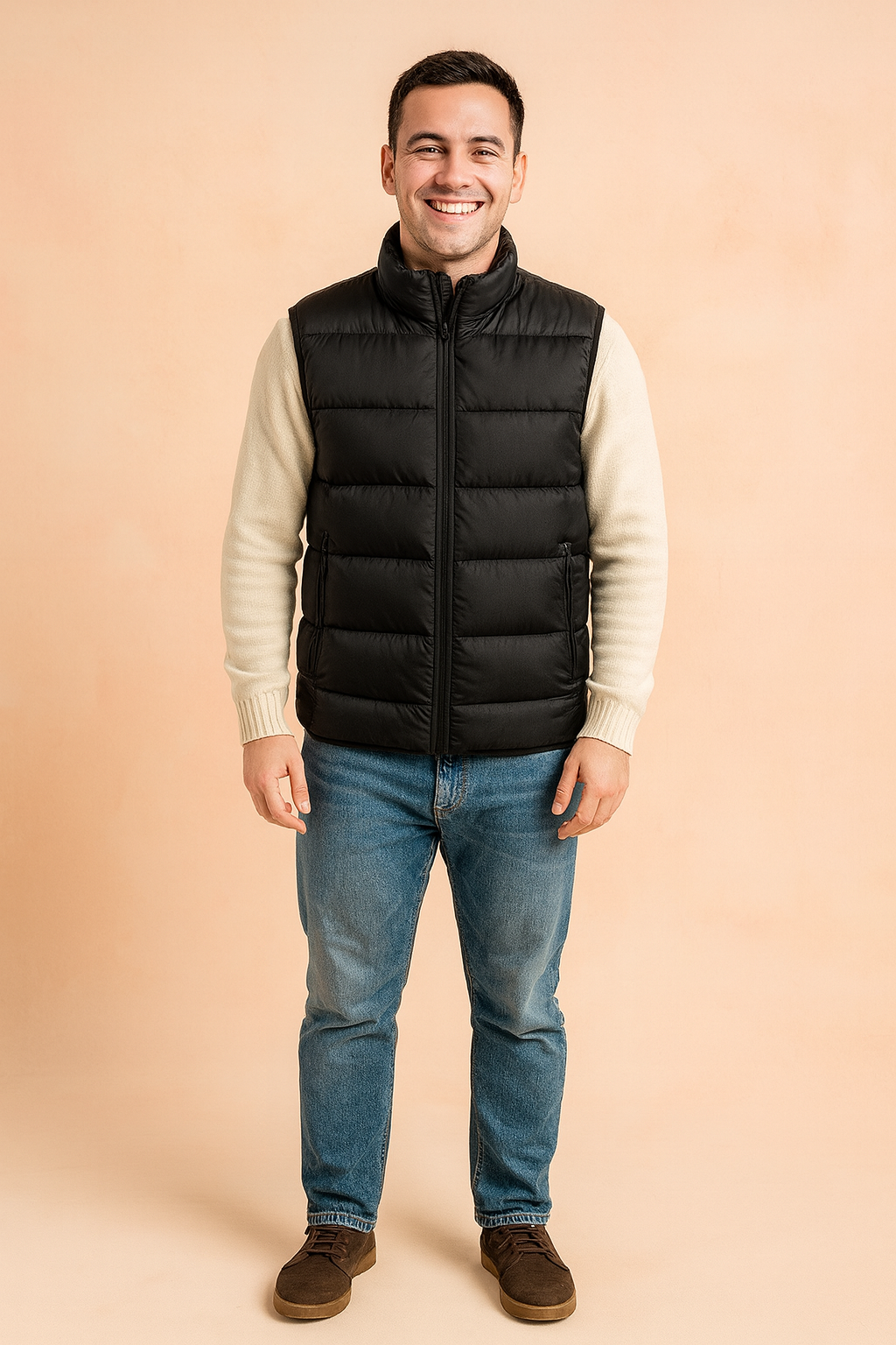 Black puffer vest for men styled with a high collar and front zipper pockets, layered over an off-white sweater for a warm, casual winter look.