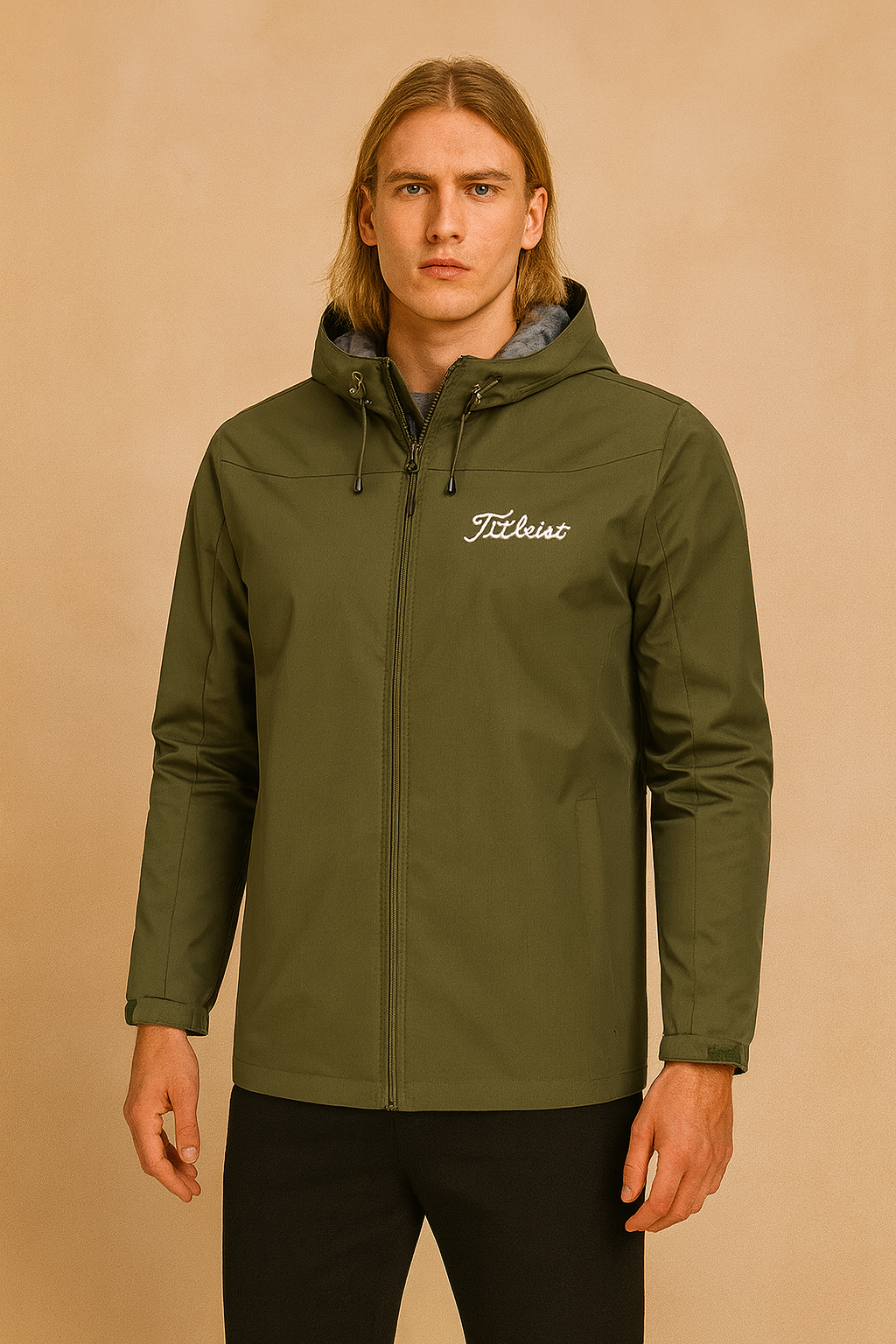 Oliwkowa sportowa kurtka męska Titleist z kapturem i zamkiem błyskawicznym, lekka i wodoodporna, idealna na deszczowe dni.