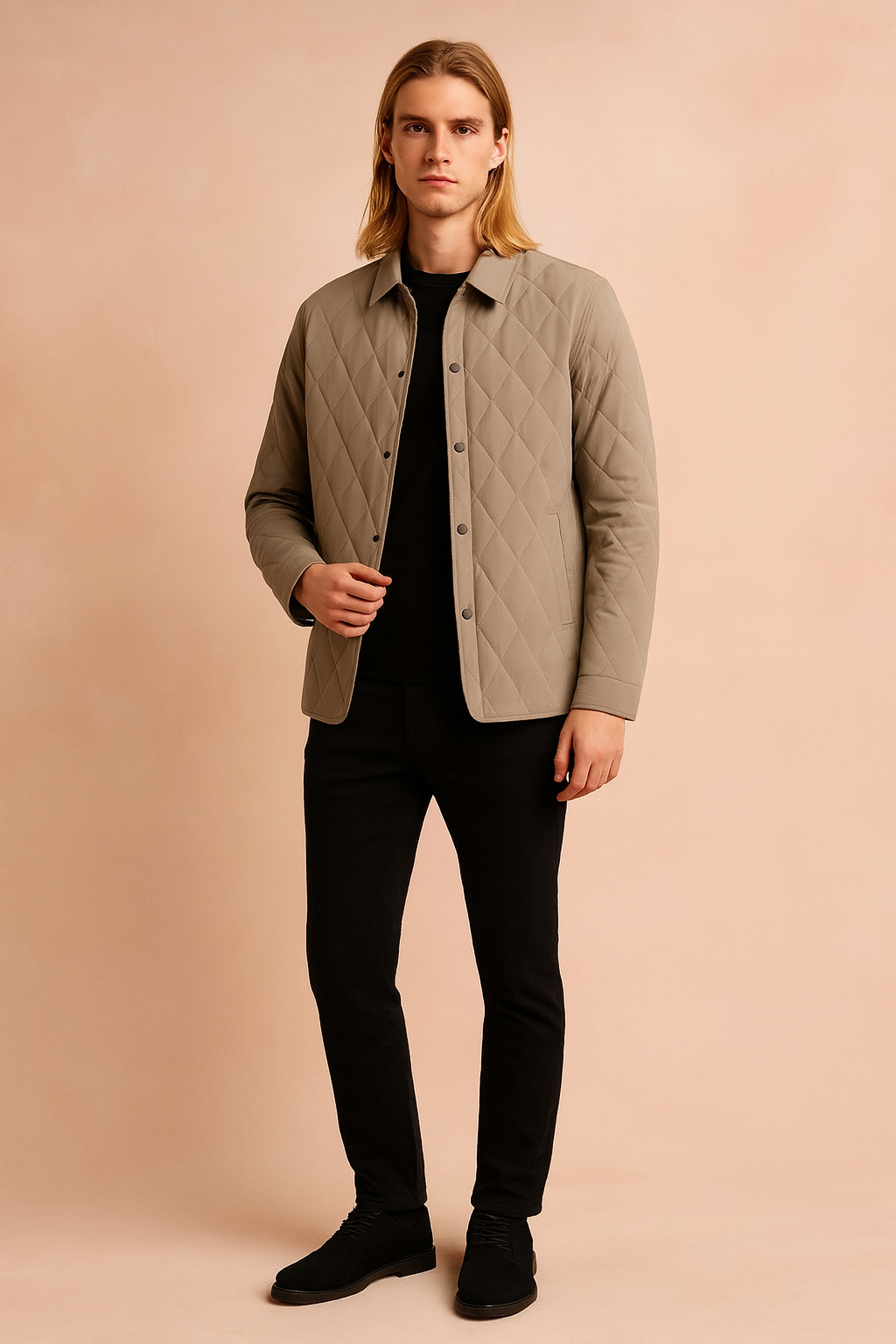 beżowa męska pikowana kurtka o prostym kroju, zapinana na zatrzaski, z bocznymi kieszeniami i klasycznym kołnierzem