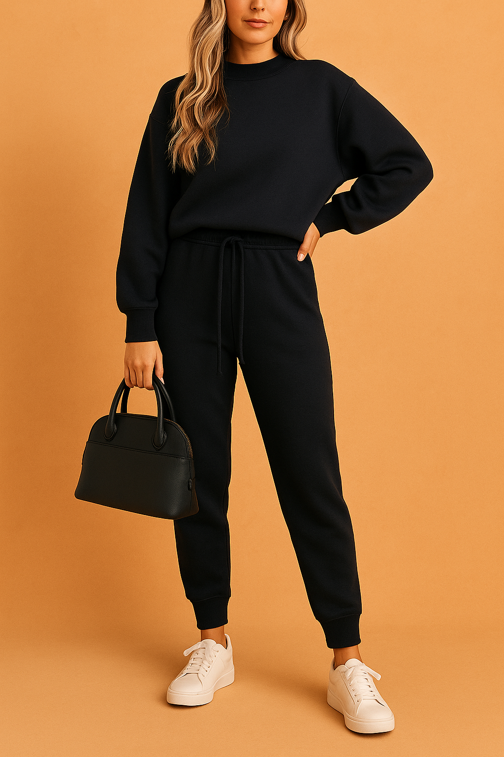 Sleek black knit sweater and jogger co-ord with drawstring waist and ribbed cuffs, styled with a structured navy handbag and classic white sneakers for a polished casual look.