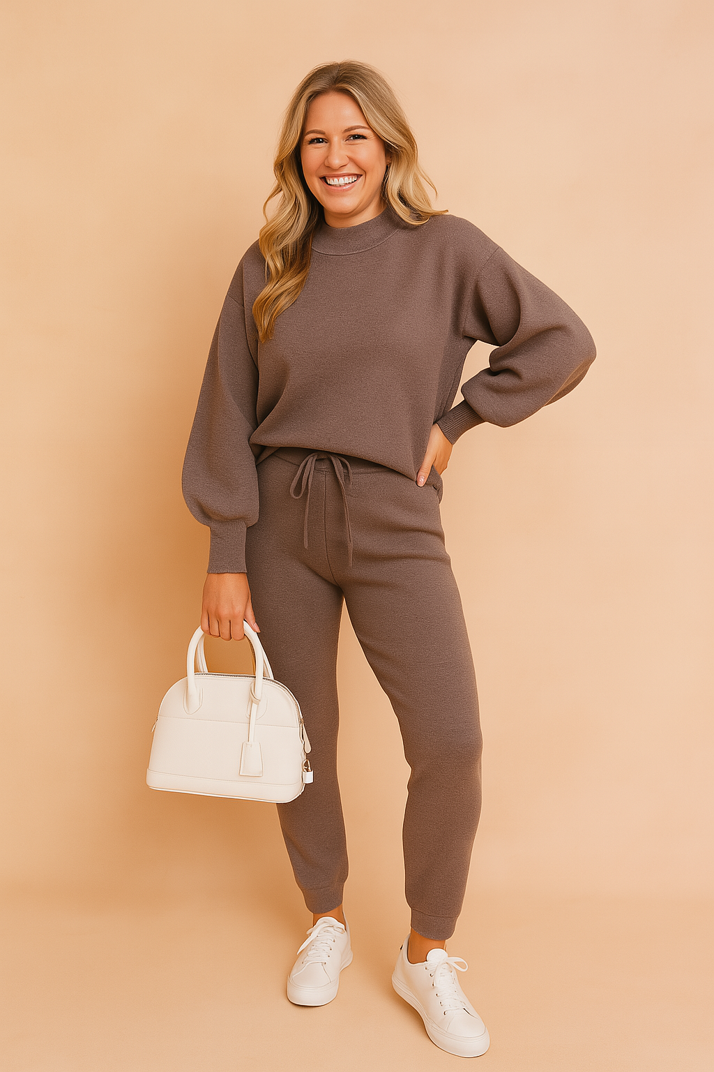 Two-piece knit lounge set featuring a relaxed-fit taupe pullover top with balloon sleeves and matching high-waisted drawstring pants, both crafted in a soft textured fabric. Styled with clean white sneakers and a structured white handbag for a cozy yet polished casual look.