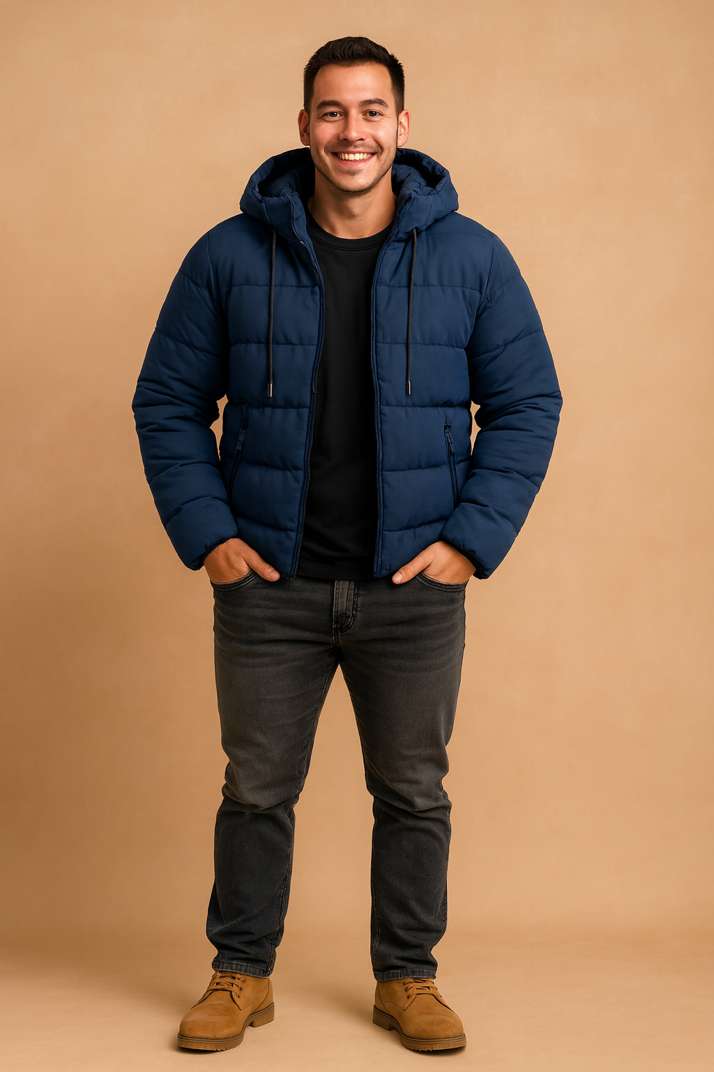 Men's navy blue puffer jacket with hood, black t-shirt, dark gray jeans, and tan suede boots
