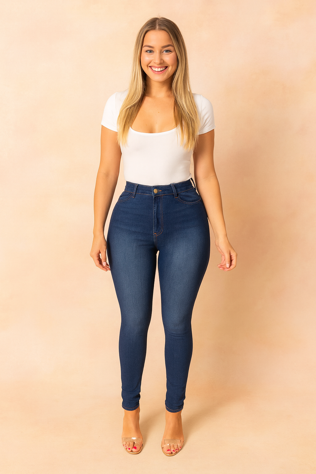 High-waisted dark blue skinny jeggings for women with back pocket details and seamless stretch fit, designed for a flattering everyday look