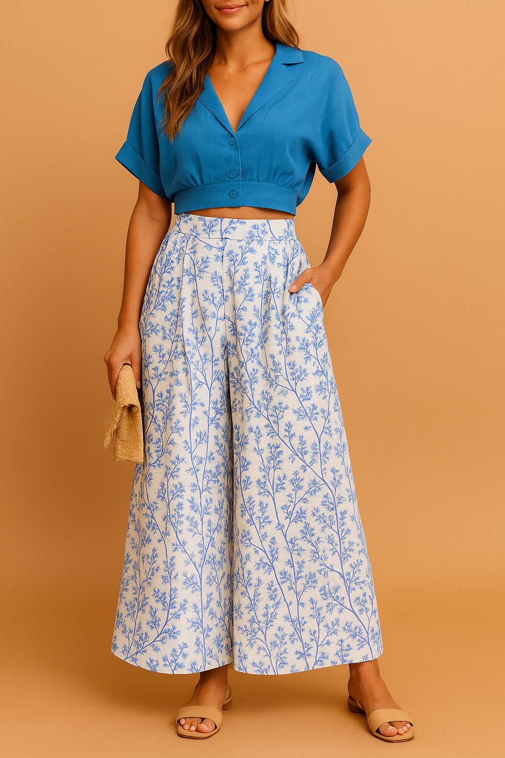 Two-piece summer set featuring a cropped button-up blue blouse with cuffed short sleeves and high-waisted wide-leg trousers in a white base with soft blue botanical print.