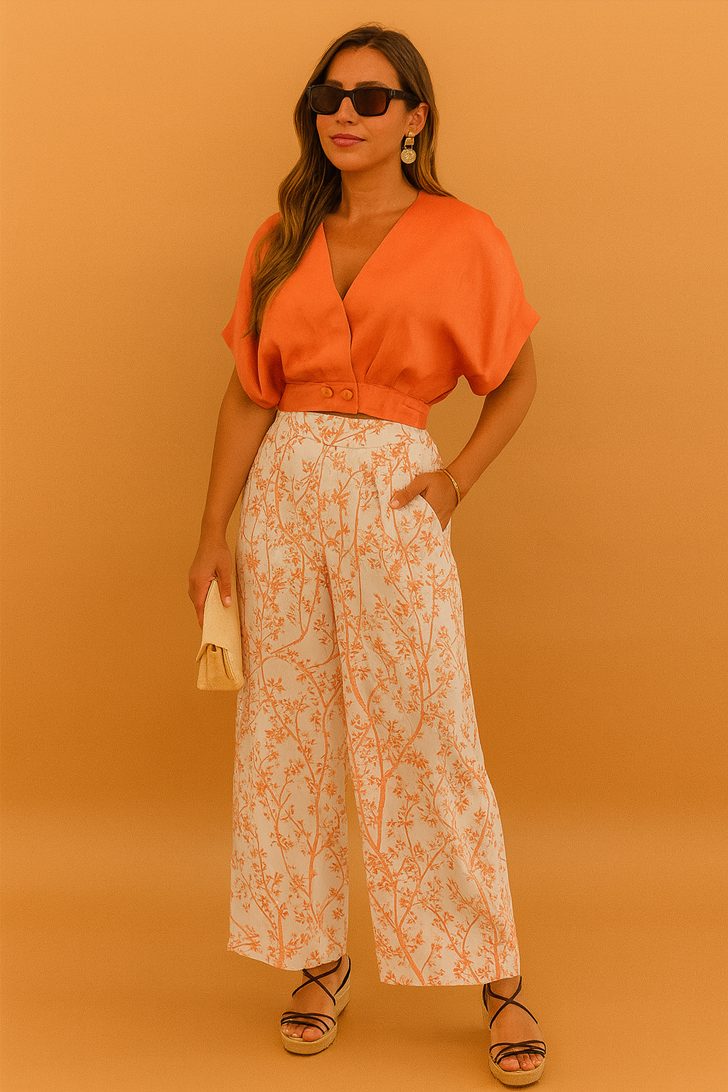 Elegant two-piece outfit featuring a structured orange cropped blouse with short sleeves and high-waisted wide-leg pants adorned with a delicate peach floral print.