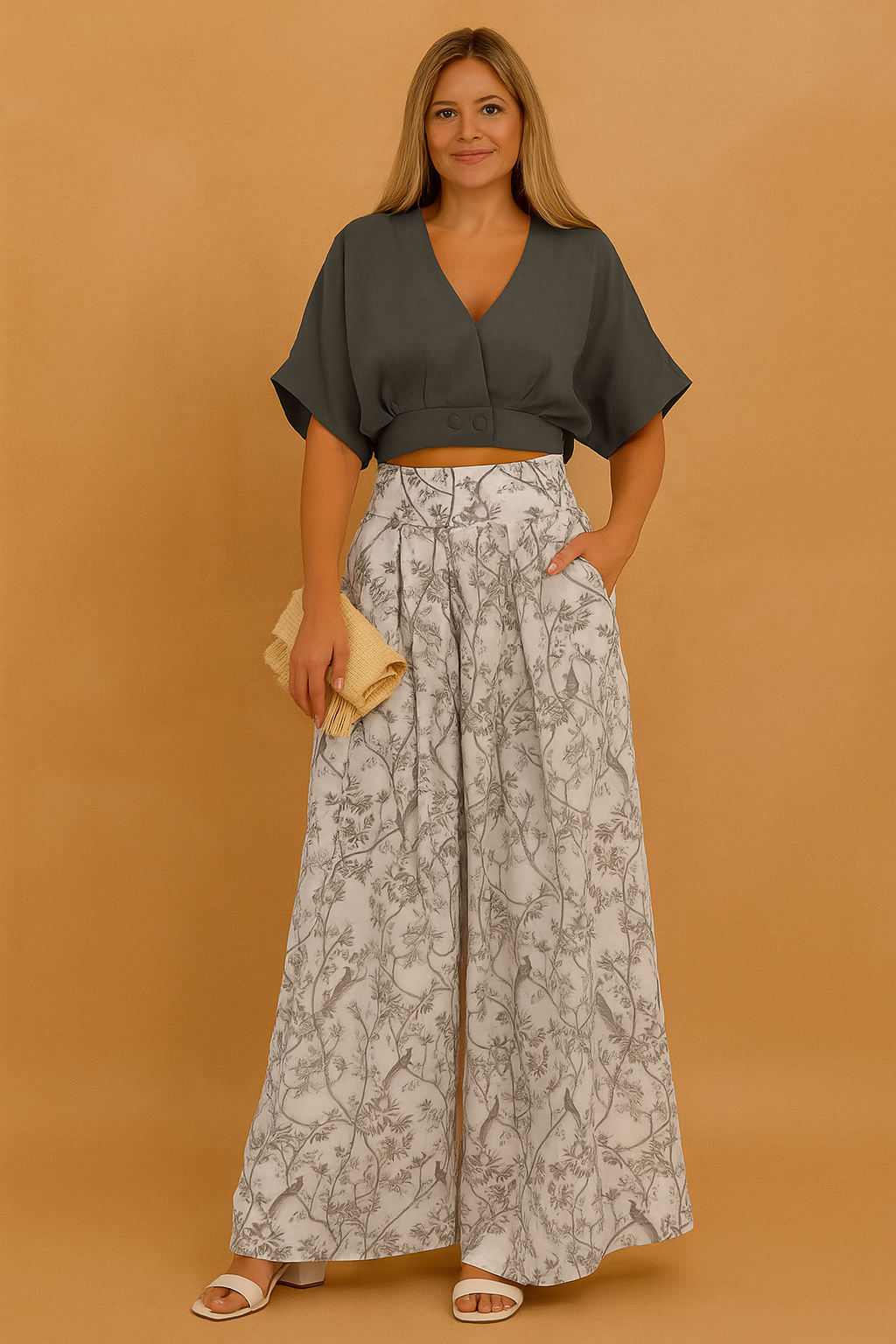 Cropped charcoal blouse with wide sleeves paired with high-waisted wide-leg trousers in white, printed with intricate grey botanical patterns, styled with white heeled sandals and a woven beige clutch.