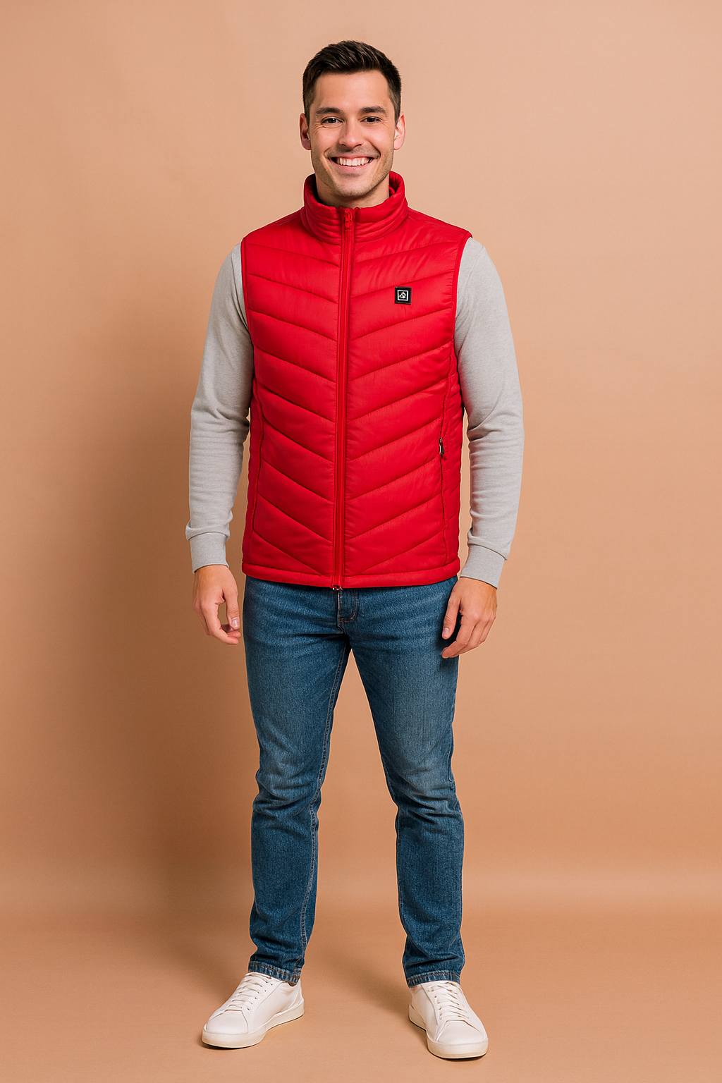 Men’s red heated vest with chevron quilted design, full zip closure, and high collar. Paired with jeans and brown casual shoes for a modern, practical look