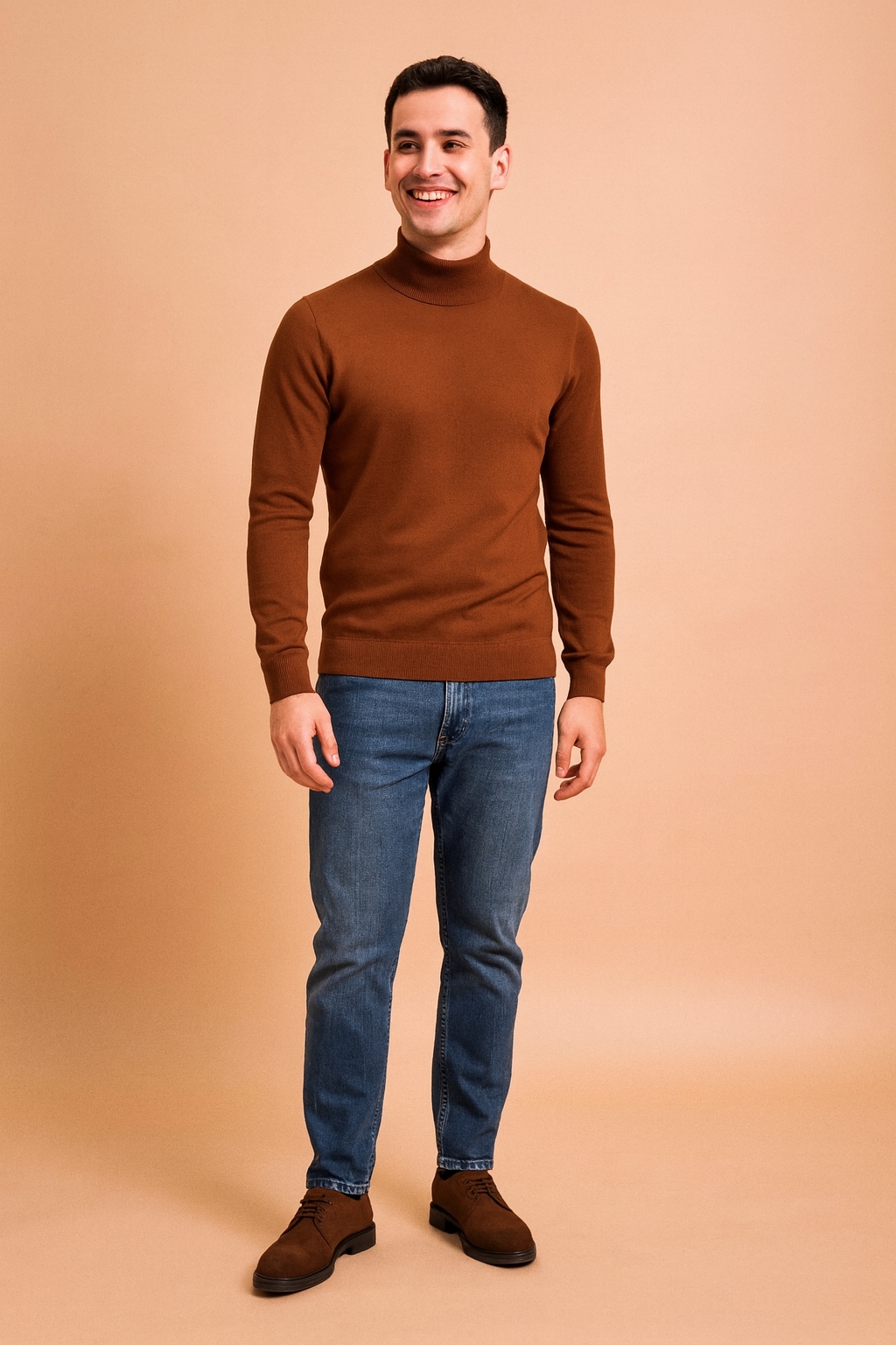Slim-fit olive green turtleneck sweater with ribbed cuffs and hem, paired with dark indigo jeans and brown suede lace-up shoes.