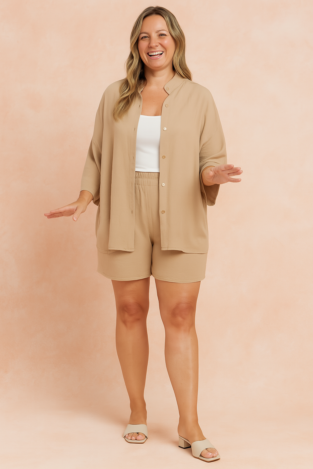 Beige oversized button-up shirt with dropped shoulders paired with matching high-waisted loose shorts in soft, flowy fabric; styled over a white cropped tank top.