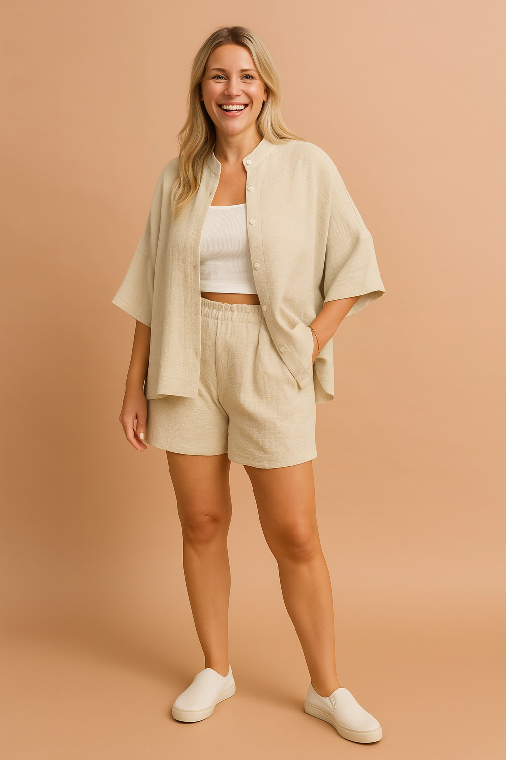 Beige textured linen two-piece lounge set featuring a loose short-sleeve button-up shirt with a high collar and matching high-waisted elastic shorts.